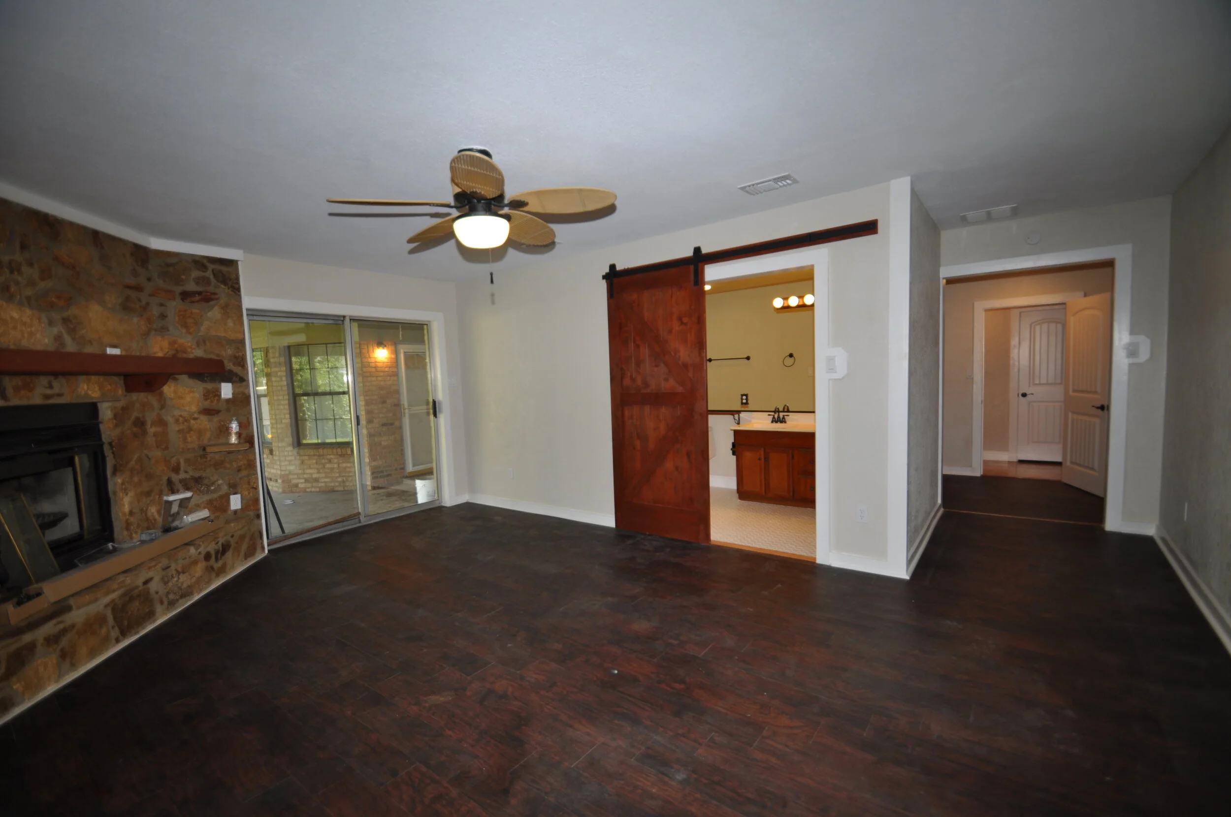 Master bedroom with wood burning fireplace and barn door to large bathroom
