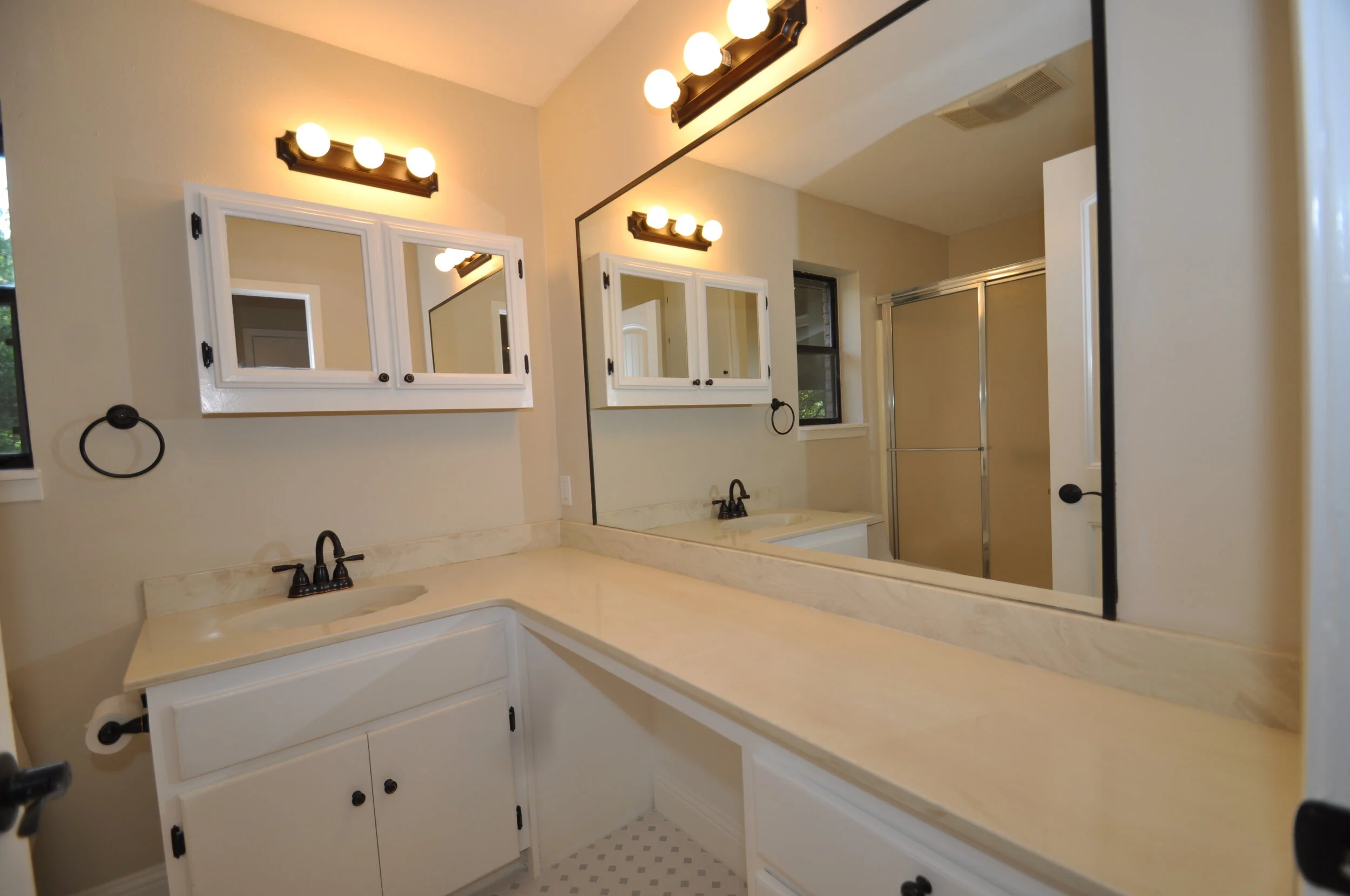 Master bathroom with marble counters and blue tooth extractor vent/light